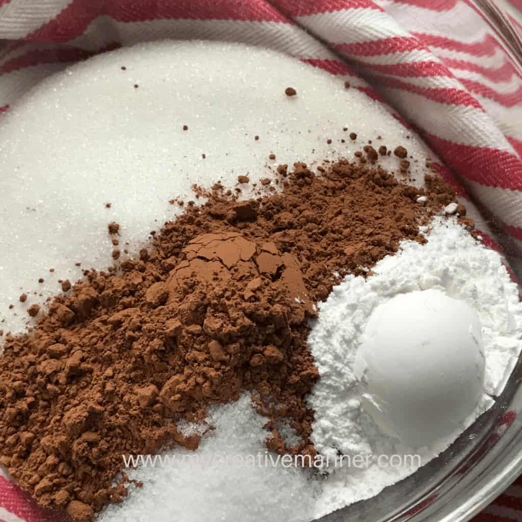In a small bowl mix together 1 Cup Sugar, 1 Cup Flour, 3 Tablespoons Unsweetened Cocoa, 2 teaspoons Baking Powder, and ½ teaspoon salt. Set aside.