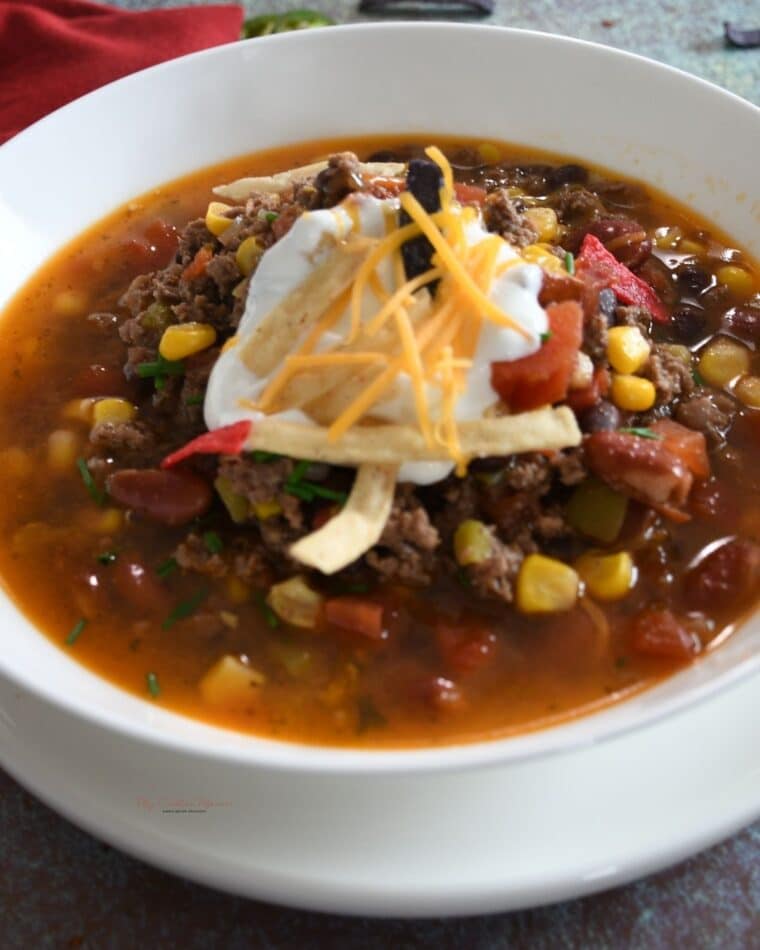 Grab a bowl and fill it up with this easy taco soup recipe. Top with some of your favorite toppings like cheddar cheese, sour cream, fresh red bell pepper, green onions, and tortilla strips for added taco flavors. Or even use tortilla chips to scoop this delicious taco soup up. I have even used plain Greek yogurt in replacement of sour cream and it was amazing. Sprinkle some fresh cilantro for a citrusy and peppery herbaceous flavor.
